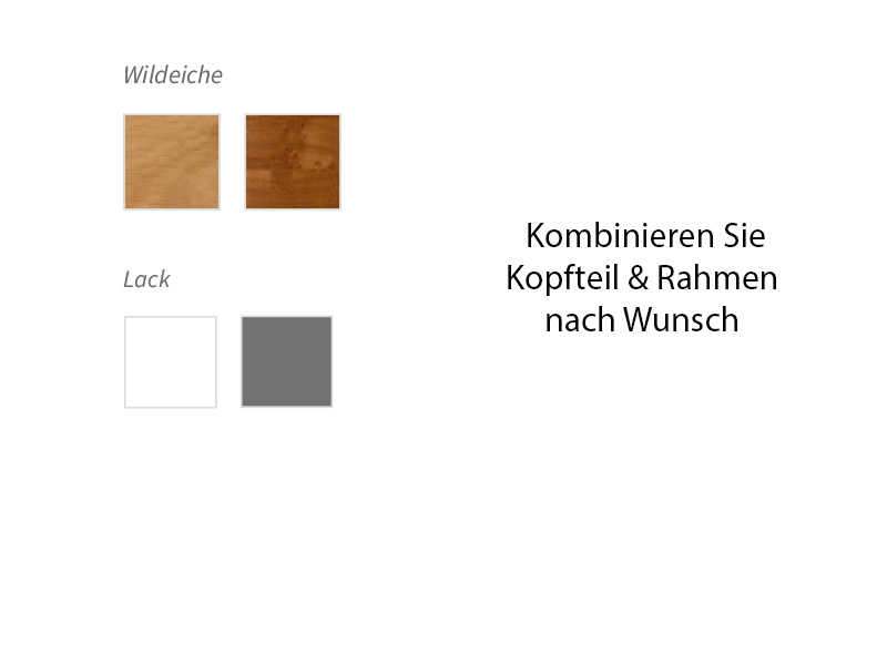 Das Komfortbett Kantos ist vielseitig. Wir fertigen dieses Bettmodell in allen gängigen Einzelbett- und Doppelbettgrößen. "Mix it" heißt es hier: Wählen Sie das Bettkopfteil sowie den Bettrahmen in Wildeiche - Farbton natur oder tabak, kombinieren Sie mit einem Bettrahmen in Lack weiß oder grau. Oder lieber andersherum? Doch gleichfarbig? Ihnen sind hier keine Grenzen gesetzt - werden Sie kreativ!