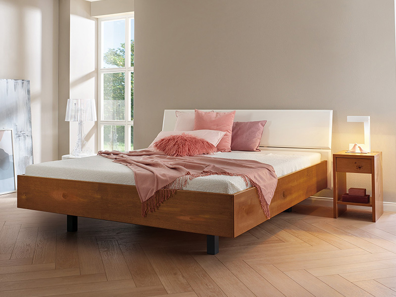 Das Komfortbett Kantos besitzt eine klare Formensprache: sein durchgängig kantiges Design wirkt modern und zugleich zeitlos. Die leicht nach hinten geneigte Kopfteilfläche von KANTOS ist aus massiver Eiche gefertigt. Diese zeigt hier ihre natürliche Schönheit. Beide Massivholzflächen des Bettkopfteiles sind umlaufend leicht schräg profiliert. So kommt der Strukturverlauf des Naturmaterials Holz wunderbar zur Geltung. Das kantige Design wiederholt sich auch am Bettrahmen. Die Eckverbindung von Bettseiten und Fußteil sind auf Gehrung gearbeitet. Die Optik des Bettes ist „schwebend“.