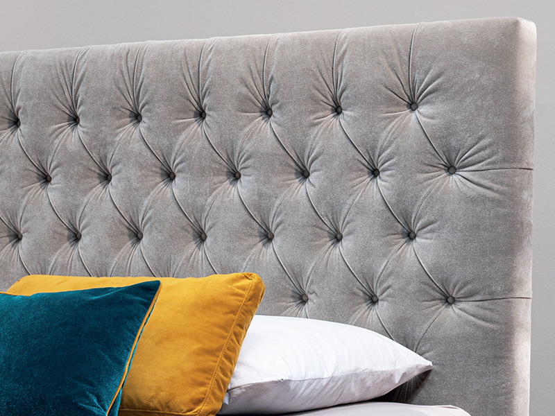 Das Kopfteil Bardolino mit einer Gesamthöhe von 140 cm ziert eine quadratische oder rautenförmige Heftungmit stoffbezogenen Knöpfen, welche auf Wunsch farblich abgesetzt werden können. Beide Kopfteile sind extra stark gepolstert (12 cm) und bieten neben der optisch eindrucksvollen Kulisse einen hohen Komfort. Aufgrund der Heftung kann der Bardolino-Bezug nicht abgezogen werden.