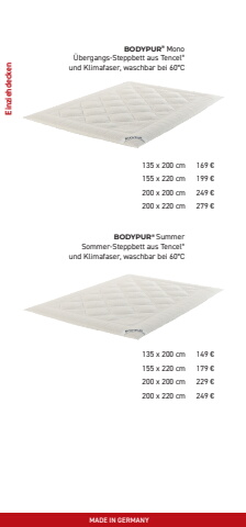 MADE IN GERMANY BODYPUR%u00ae Mono %u00dcbergangs-Steppbett aus Tencel%u00ae und Klimafaser, waschbar bei 60%u00b0C 135 x 200 cm 169 %u20ac 155 x 220 cm 199 %u20ac 200 x 200 cm 249 %u20ac 200 x 220 cm 279 %u20acBODYPUR%u00ae Summer Sommer-Steppbett aus Tencel%u00aeund Klimafaser, waschbar bei 60%u00b0C 135 x 200 cm 149 %u20ac 155 x 220 cm 179 %u20ac 200 x 200 cm 229 %u20ac 200 x 220 cm 249 %u20ac Einziehdecken