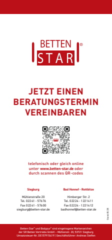 SiegburgM%u00fchlenstra%u00dfe 20Tel. 02241 - 57676Fax 02241 - 57600siegburg@betten-star.deBad Honnef - RottbitzeHimberger Str. 2Tel. 02224 - 1221411Fax 02224 - 1221412badhonnef@betten-star.deBetten-Star%u00ae und Bodypur%u00ae sind eingetragene Markenzeichender SR Betten Vertriebs GmbH %u2013 M%u00fchlenstr. 20, 53721 SiegburgUmsatzsteuer-Nr. DE157915419 | Gesch%u00e4ftsf%u00fchrer: Andreas SteffenStand: 05/25JETZT EINEN BERATUNGSTERMIN VEREINBARENtelefonisch oder gleich online unter www.betten-star.de oderdurch scannen des QR-codes