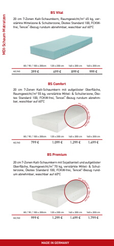 MADE IN GERMANY mit aufgel%u00f6ster Oberf%u00e4chemit aufgel%u00f6ster Oberf%u00e4cheBS Vital20 cm 7-Zonen Kalt-Schaumkern, Raumgewicht/m3 45 kg, verst%u00e4rkte Mittelzone & Schulterzone, %u00d6kotex Standard 100, FCKWfrei, Tencel%u00ae-Bezug rundum abnehmbar, waschbar auf 60%u00b0C80 / 90 / 100 x 200cm 120 x 200 cm 140 x 200 cm 160 x 200 cm H2/H3 399 %u20ac 699 %u20ac 899 %u20ac 999 %u20acBS Comfort20 cm 7-Zonen Kalt-Schaumkern mit aufgel%u00f6ster Oberfl%u00e4che, Raumgewicht/m3 55 kg, verst%u00e4rkte Mittel- & Schulterzone, %u00d6kotex Standard 100, FCKW-frei, Tencel%u00ae-Bezug rundum abnehmbar, waschbar auf 60%u00b0C80 / 90 / 100 x 200cm 120 x 200 cm 140 x 200 cm 160 x 200 cm H2/H3 799 %u20ac 1.099 %u20ac 1.299 %u20ac 1.499 %u20acBS Premium20 cm 7-Zonen Kalt-Schaumkern mit Soja%u00f6lanteil und aufgel%u00f6ster Oberfl%u00e4che, Raumgewicht/m3 70 kg, verst%u00e4rkte Mittel- & Schulterzone, %u00d6kotex Standard 100, FCKW-frei, Tencel%u00ae-Bezug rundum abnehmbar, waschbar auf 60%u00b0C80 / 90 / 100 x 200cm 120 x 200 cm 140 x 200 cm 160 x 200 cm H2/H3 999 %u20ac 1.299 %u20ac 1.499 %u20ac 1.799 %u20acMDI-Schaum-Matratzen