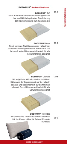 MADE IN GERMANYBODYPUR%u00ae Nackenst%u00fctzkissenBODYPUR%u00ae Soft Durch BODYPUR%u00ae-Schaum in allen Lagen formbar und l%u00e4dt bei optimaler Stabilisierung der Halswirbels%u00e4ule zum Kuscheln ein.99 %u20acBODYPUR%u00ae Wave Bietet optimale Stabilisierung der Halswirbels%u00e4ule durch die ergonomische Wellenform und ist durch seine H%u00f6henverstellbarkeit f%u00fcr alle Schulterbreiten geeignet.99 %u20acBODYPUR%u00ae Ultimate Mit aufgel%u00f6ster W%u00fcrfelprofileinschnitt-Oberfl%u00e4che wird der Anpressdruck auf die Halswirbels%u00e4ule und Nackenbereich auf ein Minimum reduziert. Durch H%u00f6henverstellbarkeit f%u00fcr alle Schultertypen geeignet.129 %u20acBODYPUR%u00ae Travelbag Ein praktisches Zubeh%u00f6r f%u00fcr Schutz und Mobilit%u00e4t der Kissen %u2013 ideal f%u00fcr Reisen, B%u00fcro oder Kurztrips.35 %u20acNackenst%u00fctzkissen