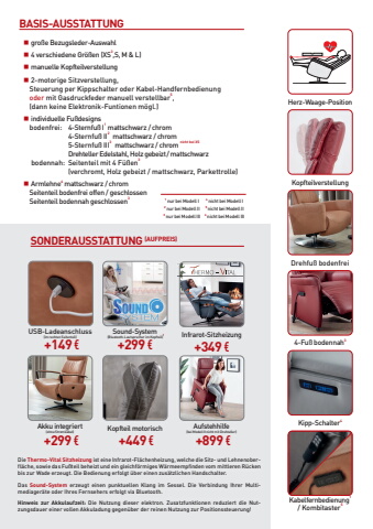Die Thermo-Vital Sitzheizung ist eine Infrarot-Fl%u00e4chenheizung, welche die Sitz- und Lehnenoberfl%u00e4che, sowie das Fu%u00dfteil beheizt und ein gleichf%u00f6rmiges W%u00e4rmeempfinden vom mittleren R%u00fccken bis zur Wade erzeugt. Die Bedienung erfolgt %u00fcber einen zus%u00e4tzlichen Handschalter. Das Sound-System erzeugt einen punktuellen Klang im Sessel. Die Verbindung Ihrer Multimediager%u00e4te oder Ihres Fernsehers erfolgt via Bluetooth.Hinweis zur Akkulaufzeit: Die Nutzung dieser elektron. Zusatzfunktionen reduziert die Nutzungsdauer einer vollen Akkuladung gegen%u00fcber der reinen Nutzung zur Positionssteuerung!BASIS-AUSSTATTUNG USB-Ladeanschluss Sound-System(im rechten Seitenteil)Kopfteil motorisch Akku integriert (ohne Stromkabel)+299 %u20acAufstehhilfe(bei Modell II nicht mit Drehteller)+449 %u20ac +899 %u20ac+149 %u20ac +299 %u20ac%u0084 gro%u00dfe Bezugsleder-Auswahl%u0084 4 verschiedene Gr%u00f6%u00dfen (XS3,S, M & L)%u0084 manuelle Kopfteilverstellung%u0084 2-motorige Sitzverstellung, Steuerung per Kippschalter oder Kabel-Handfernbedienungoder mit Gasdruckfeder manuell verstellbar5,(dann keine Elektronik-Funtionen m%u00f6gl.) %u0084 individuelle Fu%u00dfdesigns bodenfrei: 4-Sternfu%u00df I1 mattschwarz / chrom 4-Sternfu%u00df II2 mattschwarz / chrom5-Sternfu%u00df III3 mattschwarz / chrom nicht bei XSDrehteller Edelstahl, Holz gebeizt/ mattschwarz bodennah: Seitenteil mit 4 F%u00fc%u00dfen3(verchromt, Holz gebeizt / mattschwarz, Parkettrolle)%u0084 Armlehne6 mattschwarz / chromSeitenteil bodenfrei offen / geschlossenSeitenteil bodennah geschlossen3SONDERAUSSTATTUNG (AUFPREIS)Infrarot-Sitzheizung+349 %u20acBezugsvariante (BV): muster/uniBV 1R%u00fccken: PUR-SchaumK%u00f6rpergr%u00f6%u00dfe bis ca 173 cm K%u00f6rpergr%u00f6%u00dfe bis ca 185 Sitz: KaltschaumHerz-Waage-PositionBHolzbeizt%u00f6ne: siehe BeiztonkarteDrehteller Holz:Herz-Waage-PositionKipp-Schalter4Kabelfernbedienung1 / Kombitaster5KopfteilverstellungDrehfu%u00df bodenfrei4-Fu%u00df bodennah3 1 nur bei Modell I2 nur bei Modell II3 nur bei Modell III4 nicht bei Modell I5 nicht bei Modell II6 nicht bei Modell III(Bluetooth-Lautsprecher im Kopfteil)12TypenskizzenTypennummernDrehgestell: motorisch: Arretierung! ca. 300%u00b0 drehbarMotorische Bedienung: Bitte w%u00e4hlen Sie zwischen Handschaltung (HS) und KipptasDie Ladebuchse befindet sich am(davor stehend) im hinteren BereUSB Ladeslot:Sound-SystemAufpreisartikelThermo-VitalAufstehhilfeAkku (integriert)motorische KopfteilverstellungModellbezeichnungLedergruppeBoleroLonglifeLonglifeNoblesseTV-Sessel manuell mit GasfederTV-Sessel manuell mit GasfederTV-Smamit GTV-Sessel Standard: 2 MotorenTV-Sessel Standard: 2 Motoren