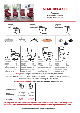 1R%u00fccken: PUR-SchaumGesamth%u00f6he 110Sitzh%u00f6he: 45Sitztiefe: 49Liegefl%u00e4che 56x157Stellma%u00dfe verwandelt 162K%u00f6rpergr%u00f6%u00dfe bis ca 173 cm Gesamth%u00f6he 115Sitzh%u00f6he: 47Sitztiefe: 51Liegefl%u00e4che 56x162 Stellma%u00dfe verwandelt 167 K%u00f6rpergr%u00f6%u00dfe bis ca 185 cm Gesamth%u00f6he 120Sitzh%u00f6he: 49Sitztiefe: 53Liegefl%u00e4che 56x167 Stellma%u00dfe verwandelt 172K%u00f6rpergr%u00f6%u00dfe ab ca 186 cm S M Lsmall medium large Gesamth%u00f6he 110 Gesamth%u00f6he 115 Gesamth%u00f6he 120 Sitz: Kaltschaum SOFT Inklusive KopfteilverstellungArmteil Polster offenArmteil Metall Black mattArmteil Polster geschlossenModellbezeichnungTypennummernTV-Sessel STAR RELAX 3TV-Sessel manuell mit GasfederTV-Sessel Standard: 2 MotorenSTAR-RELAX IIITypenplanMa%u00dfangaben ca. in cm Brutto-Preise in Euro2.499 %u20ac 2.999 %u20acDie Aufpreise f%u00fcr zus%u00e4tzliche elektronische Funktionen - nur f%u00fcr motor. Sessel optionalerh%u00e4ltlich - entnehmen Sie bitte der %u00dcbersicht Sonderausstattung auf der ersten Seite!Die motorische Bedienung erfolgt mit Kombitaster.EchtlederAchtung! Ausf%u00fchrung mit Aufstehhilfe + 2 cm bei Sitzh%u00f6he / Gesamth%u00f6heR%u00fcckenspannteile: Das Modell hat komplett echte R%u00fccken.2 Sitzkomforts preisgleich! Sitz: Kaltschaum soft oder TaschenfederkernGesamth%u00f6he 113Sitzh%u00f6he: 47Sitztiefe:%u0009%u0009%u0009%u0009%u0009%u000953Gesamth%u00f6he 120Sitzh%u00f6he: 49Sitztiefe:%u0009%u0009%u0009%u0009%u0009%u000955M Lmedium large Gesamth%u00f6he 113 Gesamth%u00f6he 120n1Seitenteil bodenfrei geschlossenR%u00fccken: PUR-SchaumGesamth%u00f6he 104Sitzh%u00f6he: 43Sitztiefe: 49Liegefl%u00e4che%u0009 %u0009%u0009%u0009%u000945x155Stellma%u00dfe verwandelt%u0009%u0009155K%u00f6rpergr%u00f6%u00dfe bis ca 165 cmGewicht bis 150 kg%u0009%u0009Gesamth%u00f6he 113Sitzh%u00f6he: 47Sitztiefe:%u0009%u0009 %u0009%u0009%u0009%u000953Liegefl%u00e4che%u0009 %u0009%u0009%u0009%u000945x165Stellma%u00dfe verwandelt%u0009%u0009165K%u00f6rpergr%u00f6%u00dfe bis ca 185 cm%u0009%u0009Gewicht bis 150 kgGesamth%u00f6he 120Sitzh%u00f6he: 49Sitztiefe:%u0009%u0009 %u0009%u0009%u0009%u000955Liegefl%u00e4che %u0009%u0009%u0009%u000945x170Stellma%u00dfe verwandelt 170 K%u00f6rpergr%u00f6%u00dfe ab ca 186 cm Gewicht bis 150 kg%u0009%u0009XS M Lextra small medium large Gesamth%u00f6he 106 Gesamth%u00f6he 113 Gesamth%u00f6he 120 Sitz: Kaltschaum SOFT oder Federkern (Taschenfederkern) Inklusive KopfteilverstellungSeitenteil bodennah geschlossenSeitenteil bodenfrei offenGesamth%u00f6he 106Sitzh%u00f6he: %u0009%u0009%u0009%u000945Sitztiefe:%u0009%u0009 %u0009%u0009%u0009%u000951Liegefl%u00e4che%u0009 %u0009%u0009%u0009%u000945x160Stellma%u00dfe verwandelt 160K%u00f6rpergr%u00f6%u00dfe bis ca 173 cmGewicht bis 150 kg%u0009%u0009Gesamth%u00f6he 104SsmallAusf%u00fchrung mit Aufstehhilfe: Sitzh%u00f6he und Gesamth%u00f6he + 2 cmSeitenteil bodenfrei geschlossenPUR-Schaum1044349%u0009%u0009%u0009%u000945x155wandelt%u0009%u0009155bis ca 165 cm50 kg%u0009%u0009Gesamth%u00f6he 113Sitzh%u00f6he: 47Sitztiefe:%u0009%u0009 %u0009%u0009%u0009%u000953Liegefl%u00e4che%u0009 %u0009%u0009%u0009%u000945x165Stellma%u00dfe verwandelt%u0009%u0009165K%u00f6rpergr%u00f6%u00dfe bis ca 185 cm%u0009%u0009Gewicht bis 150 kgGesamth%u00f6he Sitzh%u00f6he: Sitztiefe:%u0009%u0009 Liegefl%u00e4che Stellma%u00dfe verwandK%u00f6rpergr%u00f6%u00dfe ab caGewicht bis 150 kgM Lmedium large Gesamth%u00f6he 106 Gesamth%u00f6he 113 Gesamth%u00f6he 120 Inklusive KopfteilverstellungSeitenteil bodennah geschlosseneitenteil odenfrei ffenGesamth%u00f6he 106Sitzh%u00f6he: %u0009%u0009%u0009%u000945Sitztiefe:%u0009%u0009 %u0009%u0009%u0009%u000951Liegefl%u00e4che%u0009 %u0009%u0009%u0009%u000945x160Stellma%u00dfe verwandelt 160K%u00f6rpergr%u00f6%u00dfe bis ca 173 cmGewicht bis 150 kg%u0009%u0009SsmallAusf%u00fchrung mit Aufstehhilfe: Sitzh%u00f6he und Gesamth%u00f6he + 2 cmSeitenteil bodenfrei geschlossenR%u00fccken: PUR-SchaumGesamth%u00f6he 104Sitzh%u00f6he: 43Sitztiefe: 49Liegefl%u00e4che%u0009 %u0009%u0009%u0009%u000945x155Stellma%u00dfe verwandelt%u0009%u0009155K%u00f6rpergr%u00f6%u00dfe bis ca 165 cmGewicht bis 150 kg%u0009%u0009Gesamth%u00f6he 113Sitzh%u00f6he: 47Sitztiefe:%u0009%u0009 %u0009%u0009%u0009%u000953Liegefl%u00e4che%u0009 %u0009%u0009%u0009%u000945x165Stellma%u00dfe verwandelt%u0009%u0009165K%u00f6rpergr%u00f6%u00dfe bis ca 185 cm%u0009%u0009Gewicht bis 150 kgGesamth%u00f6he 120Sitzh%u00f6he: 49Sitztiefe:%u0009%u0009 %u0009%u0009%u0009%u000955Liegefl%u00e4che %u0009%u0009%u0009%u000945x170Stellma%u00dfe verwandelt 170 K%u00f6rpergr%u00f6%u00dfe ab ca 186 cm Gewicht bis 150 kg%u0009%u0009XS M Lextra small medium large Gesamth%u00f6he 106 Gesamth%u00f6he 113 Gesamth%u00f6he 120 Sitz: Kaltschaum SOFT oder Federkern (Taschenfederkern) Inklusive KopfteilverstellungSeitenteil bodennah geschlossenSeitenteil bodenfrei offenGesamth%u00f6he 106Sitzh%u00f6he: %u0009%u0009%u0009%u000945Sitztiefe:%u0009%u0009 %u0009%u0009%u0009%u000951Liegefl%u00e4che%u0009 %u0009%u0009%u0009%u000945x160Stellma%u00dfe verwandelt 160K%u00f6rpergr%u00f6%u00dfe bis ca 173 cmGewicht bis 150 kg%u0009%u0009Gesamth%u00f6he 104SsmallAusf%u00fchrung mit Aufstehhilfe: Sitzh%u00f6he und Gesamth%u00f6he + 2 cm1Seitenteil bodenfrei geschlossenR%u00fccken: PUR-SchaumGesamth%u00f6he 104Sitzh%u00f6he: 43Sitztiefe: 49Liegefl%u00e4che%u0009 %u0009%u0009%u0009%u000945x155Stellma%u00dfe verwandelt%u0009%u0009155K%u00f6rpergr%u00f6%u00dfe bis ca 165 cmGewicht bis 150 kg%u0009%u0009Gesamth%u00f6he 113Sitzh%u00f6he: 47Sitztiefe:%u0009%u0009 %u0009%u0009%u0009%u000953Liegefl%u00e4che%u0009 %u0009%u0009%u0009%u000945x165Stellma%u00dfe verwandelt%u0009%u0009165K%u00f6rpergr%u00f6%u00dfe bis ca 185 cm%u0009%u0009Gewicht bis 150 kgGesamth%u00f6he 120Sitzh%u00f6he: 49Sitztiefe:%u0009%u0009 %u0009%u0009%u0009%u000955Liegefl%u00e4che %u0009%u0009%u0009%u000945x170Stellma%u00dfe verwandelt 170 K%u00f6rpergr%u00f6%u00dfe ab ca 186 cm Gewicht bis 15