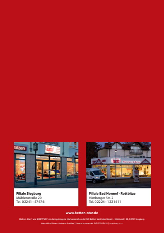 Filiale SiegburgM%u00fchlenstra%u00dfe 20Tel. 02241 - 57676Filiale Bad Honnef - RottbitzeHimberger Str. 2Tel. 02224 - 1221411Betten-Star%u00ae und BODYPUR%u00ae sind eingetragene Markenzeichen der SR Betten Vertriebs GmbH %u2013 M%u00fchlenstr. 20, 53721 Siegburg Gesch%u00e4ftsf%u00fchrer: Andreas Steffen | Umsatzsteuer-Nr. DE157915419 | Stand 04/2021www.betten-star.de