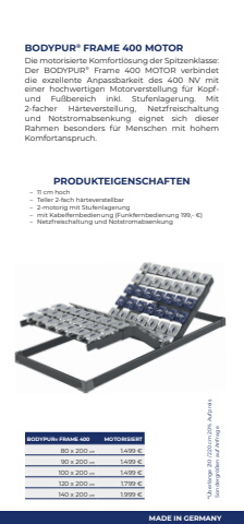 MADE IN GERMANYBODYPUR%u00ae FRAME 400 MOTORDie motorisierte Komfortl%u00f6sung der Spitzenklasse: Der BODYPUR%u00ae Frame 400 MOTOR verbindet die exzellente Anpassbarkeit des 400 NV mit einer hochwertigen Motorverstellung f%u00fcr Kopfund Fu%u00dfbereich inkl. Stufenlagerung. Mit 2-facher H%u00e4rteverstellung, Netzfreischaltung und Notstromabsenkung eignet sich dieser Rahmen besonders f%u00fcr Menschen mit hohem Komfortanspruch.BODYPUR%u00ae FRAME 400 MOTORISIERT80 x 200 cm 1.499 %u20ac90 x 200 cm 1.499 %u20ac100 x 200 cm 1.499 %u20ac120 x 200 cm 1.799 %u20ac140 x 200 cm 1.999 %u20ac *%u00dcberl%u00e4nge 210 / 220 cm 20% Aufpreis Sondergr%u00f6%u00dfen auf AnfragePRODUKTEIGENSCHAFTEN%u2013 11 cm hoch%u2013 Teller 2-fach h%u00e4rteverstellbar%u2013 2-motorig mit Stufenlagerung%u2013 mit Kabelfernbedienung (Funkfernbedienung 199,- %u20ac)%u2013 Netzfreischaltung und Notstromabsenkung