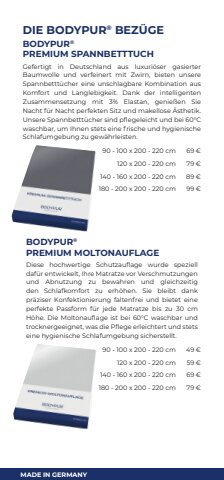 MADE IN GERMANY DIE BODYPUR%u00ae BEZ%u00dcGEBODYPUR%u00aePREMIUM SPANNBETTTUCHGefertigt in Deutschland aus luxuri%u00f6ser gasierter Baumwolle und verfeinert mit Zwirn, bieten unsere Spannbettt%u00fccher eine unschlagbare Kombination aus Komfort und Langlebigkeit. Dank der intelligenten Zusammensetzung mit 3% Elastan, genie%u00dfen Sie Nacht f%u00fcr Nacht perfekten Sitz und makellose %u00c4sthetik. Unsere Spannbettt%u00fccher sind pflegeleicht und bei 60%u00b0C waschbar, um Ihnen stets eine frische und hygienische Schlafumgebung zu gew%u00e4hrleisten.90 - 100 x 200 - 220 cm 69 %u20ac120 x 200 - 220 cm 79 %u20ac140 - 160 x 200 - 220 cm 89 %u20ac180 - 200 x 200 - 220 cm 99 %u20acBODYPUR%u00aePREMIUM MOLTONAUFLAGEDiese hochwertige Schutzauflage wurde speziell daf%u00fcr entwickelt, Ihre Matratze vor Verschmutzungen und Abnutzung zu bewahren und gleichzeitig den Schlafkomfort zu erh%u00f6hen. Sie bleibt dank pr%u00e4ziser Konfektionierung faltenfrei und bietet eine perfekte Passform f%u00fcr jede Matratze bis zu 30 cm H%u00f6he. Die Moltonauflage ist bei 60%u00b0C waschbar und trocknergeeignet, was die Pflege erleichtert und stets eine hygienische Schlafumgebung sicherstellt.90 - 100 x 200 - 220 cm 49 %u20ac120 x 200 - 220 cm 59 %u20ac140 - 160 x 200 - 220 cm 69 %u20ac180 - 200 x 200 - 220 cm 79 %u20ac