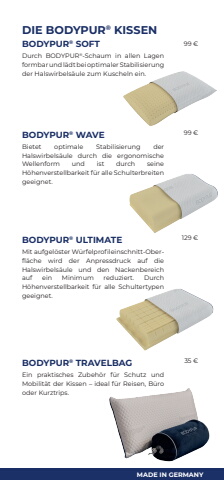 MADE IN GERMANYDIE BODYPUR%u00ae KISSENBODYPUR%u00ae SOFT Durch BODYPUR%u00ae-Schaum in allen Lagen formbar und l%u00e4dt bei optimaler Stabilisierung der Halswirbels%u00e4ule zum Kuscheln ein.99 %u20acBODYPUR%u00ae WAVE Bietet optimale Stabilisierung der Halswirbels%u00e4ule durch die ergonomische Wellenform und ist durch seine H%u00f6henverstellbarkeit f%u00fcr alle Schulterbreiten geeignet.99 %u20acBODYPUR%u00ae ULTIMATE Mit aufgel%u00f6ster W%u00fcrfelprofileinschnitt-Oberfl%u00e4che wird der Anpressdruck auf die Halswirbels%u00e4ule und den Nackenbereich auf ein Minimum reduziert. Durch H%u00f6henverstellbarkeit f%u00fcr alle Schultertypen geeignet.129 %u20acBODYPUR%u00ae TRAVELBAG Ein praktisches Zubeh%u00f6r f%u00fcr Schutz und Mobilit%u00e4t der Kissen %u2013 ideal f%u00fcr Reisen, B%u00fcro oder Kurztrips.35 %u20ac