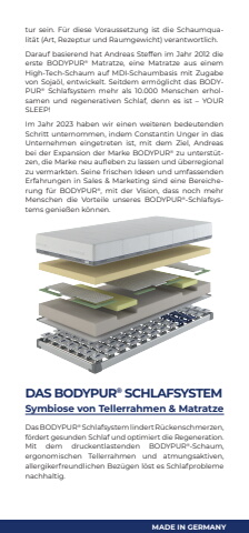 MADE IN GERMANYDAS BODYPUR%u00ae SCHLAFSYSTEM Symbiose von Tellerrahmen & MatratzeDas BODYPUR%u00ae Schlafsystem lindert R%u00fcckenschmerzen, f%u00f6rdert gesunden Schlaf und optimiert die Regeneration. Mit dem druckentlastenden BODYPUR%u00ae-Schaum, ergonomischen Tellerrahmen und atmungsaktiven, allergikerfreundlichen Bez%u00fcgen l%u00f6st es Schlafprobleme nachhaltig.tur sein. F%u00fcr diese Voraussetzung ist die Schaumqualit%u00e4t (Art, Rezeptur und Raumgewicht) verantwortlich.Darauf basierend hat Andreas Steffen im Jahr 2012 die erste BODYPUR%u00ae Matratze, eine Matratze aus einem High-Tech-Schaum auf MDI-Schaumbasis mit Zugabe von Soja%u00f6l, entwickelt. Seitdem erm%u00f6glicht das BODYPUR%u00ae Schlafsystem mehr als 10.000 Menschen erholsamen und regenerativen Schlaf, denn es ist %u2013 YOUR SLEEP!Im Jahr 2023 haben wir einen weiteren bedeutenden Schritt unternommen, indem Constantin Unger in das Unternehmen eingetreten ist, mit dem Ziel, Andreas bei der Expansion der Marke BODYPUR%u00ae zu unterst%u00fctzen, die Marke neu aufleben zu lassen und %u00fcberregional zu vermarkten. Seine frischen Ideen und umfassenden Erfahrungen in Sales & Marketing sind eine Bereicherung f%u00fcr BODYPUR%u00ae, mit der Vision, dass noch mehr Menschen die Vorteile unseres BODYPUR%u00ae-Schlafsystems genie%u00dfen k%u00f6nnen.
