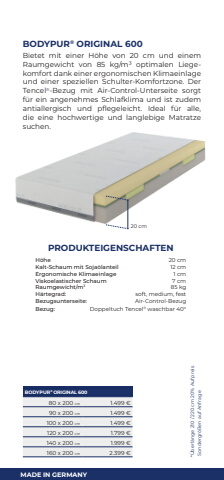 MADE IN GERMANY  20 cmBODYPUR%u00ae ORIGINAL 60080 x 200 cm 1.499 %u20ac90 x 200 cm 1.499 %u20ac100 x 200 cm 1.499 %u20ac120 x 200 cm 1.799 %u20ac140 x 200 cm 1.999 %u20ac160 x 200 cm 2.399 %u20acBODYPUR%u00ae ORIGINAL 600Bietet mit einer H%u00f6he von 20 cm und einem Raumgewicht von 85 kg/m%u00b3 optimalen Liegekomfort dank einer ergonomischen Klimaeinlage und einer speziellen Schulter-Komfortzone. Der Tencel%u00ae-Bezug mit Air-Control-Unterseite sorgt f%u00fcr ein angenehmes Schlafklima und ist zudem antiallergisch und pflegeleicht. Ideal f%u00fcr alle, die eine hochwertige und langlebige Matratze suchen. PRODUKTEIGENSCHAFTENH%u00f6he 20 cmKalt-Schaum mit Soja%u00f6lanteil 12 cmErgonomische Klimaeinlage 1 cmViskoelastischer Schaum 7 cmRaumgewicht/m3 85 kgH%u00e4rtegrad: soft, medium, festBezugsunterseite: Air-Control-BezugBezug: Doppeltuch Tencel%u00ae waschbar 40%u00b0*%u00dcberl%u00e4nge 210 / 220 cm 20% Aufpreis Sondergr%u00f6%u00dfen auf Anfrage