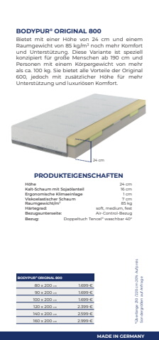 MADE IN GERMANY 24 cmBODYPUR%u00ae ORIGINAL 80080 x 200 cm 1.699 %u20ac90 x 200 cm 1.699 %u20ac100 x 200 cm 1.699 %u20ac120 x 200 cm 2.399 %u20ac140 x 200 cm 2.599 %u20ac160 x 200 cm 2.999 %u20acPRODUKTEIGENSCHAFTENH%u00f6he 24 cmKalt-Schaum mit Soja%u00f6lanteil 16 cmErgonomische Klimaeinlage 1 cmViskoelastischer Schaum 7 cmRaumgewicht/m3 85 kgH%u00e4rtegrad: soft, medium, festBezugsunterseite: Air-Control-BezugBezug: Doppeltuch Tencel%u00ae waschbar 40%u00b0BODYPUR%u00ae ORIGINAL 800Bietet mit einer H%u00f6he von 24 cm und einem Raumgewicht von 85 kg/m%u00b3 noch mehr Komfort und Unterst%u00fctzung. Diese Variante ist speziell konzipiert f%u00fcr gro%u00dfe Menschen ab 190 cm und Personen mit einem K%u00f6rpergewicht von mehr als ca. 100 kg. Sie bietet alle Vorteile der Original 600, jedoch mit zus%u00e4tzlicher H%u00f6he f%u00fcr mehr Unterst%u00fctzung und luxuri%u00f6sen Komfort.*%u00dcberl%u00e4nge 210 / 220 cm 20% Aufpreis Sondergr%u00f6%u00dfen auf Anfrage
